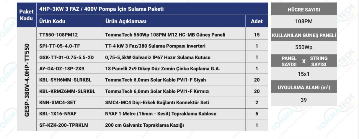 4 HP gücündeki dalgıç pompalar için özel olarak hesaplanmış, yüksek performanslı solar sulama paketi. Ýnvertör, konstrüksiyon ve yüksek verimli paneller dahil anahtar teslim çözüm.